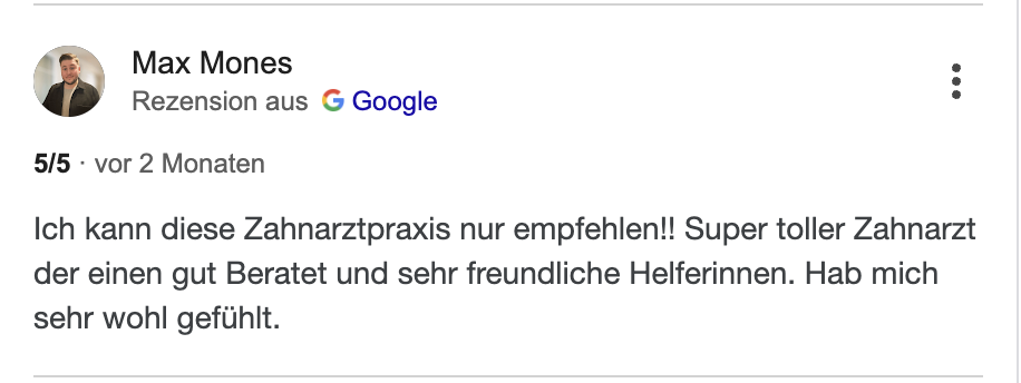 Ich kann diese Zahnarztpraxis nur empfehlen!! Super toller Zahnarzt der einen gut Beratet und sehr freundliche Helferinnen. Hab mich sehr wohl gefühlt.